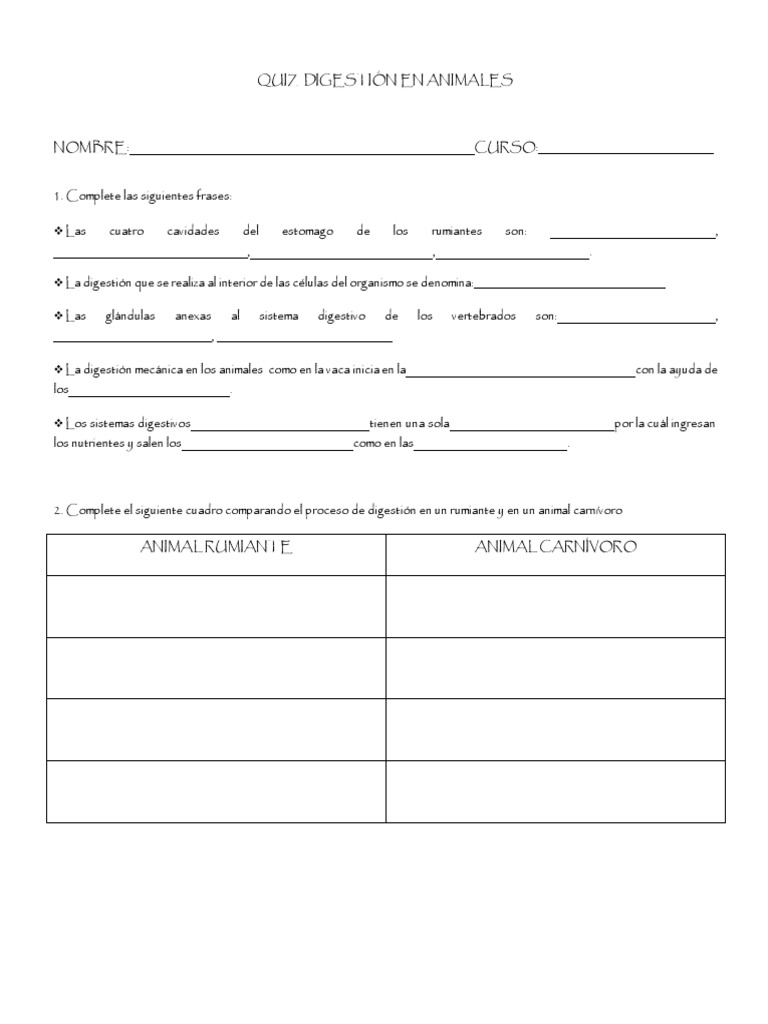 Quiz Digestion Animal PDF